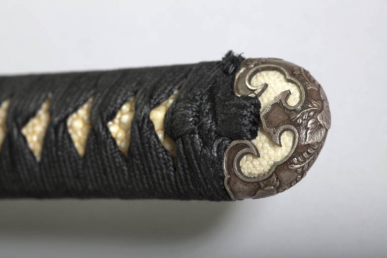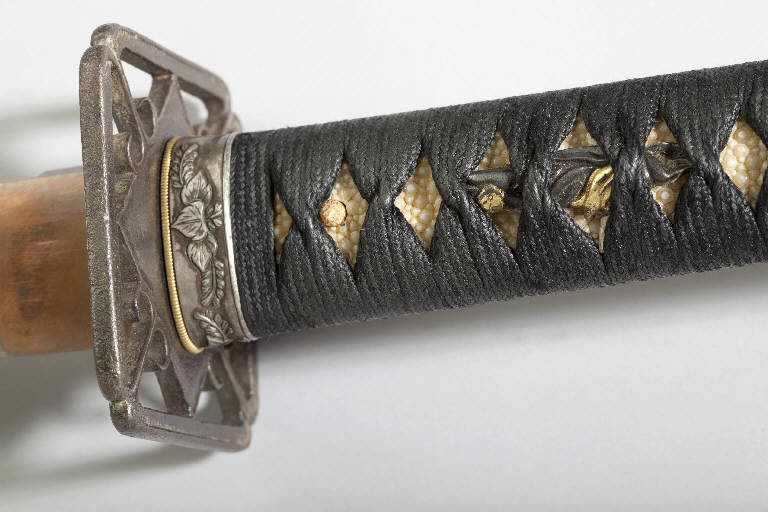 Spada (katana) con lama in acciaio. Impugnatura (tsuka) rivestita di tessuto nero (itomaki) su pelle di pesce (same). Fodero (saya) in legno laccato di nero (roironuri) con anello (kurigata). Pomo (kashira) e ghiera ornamentale (fuchi) in metallo argentato con motivo di fiori e foglie. Menuki in metallo. Tsuba quadrilobata in metallo lavorata a traforo. Manicotto (habaki) in metallo dorato con incisioni