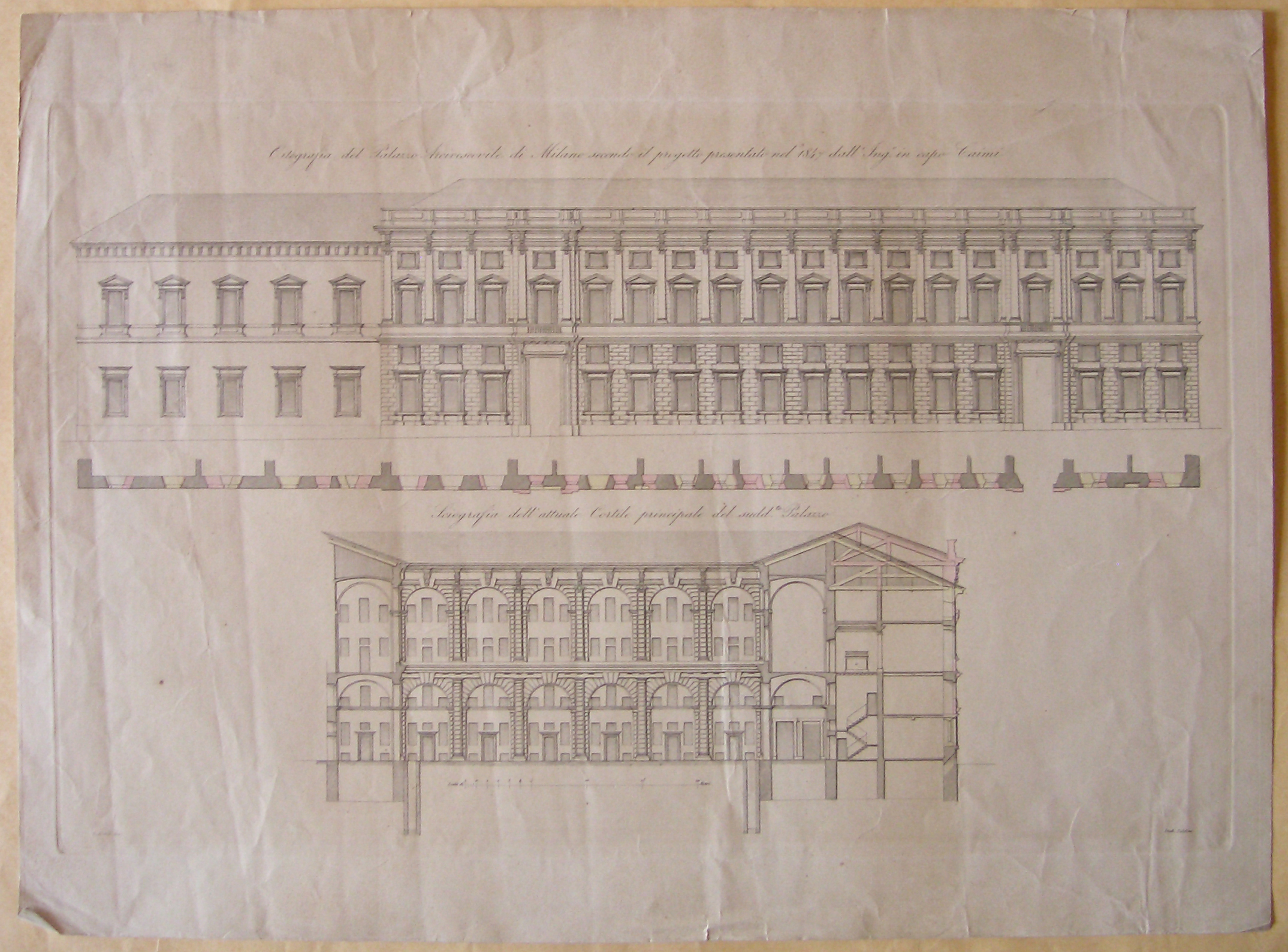 - ISCRIZIONI in alto - ORTOGRAFIA DEL PALAZZO ARCIVESCOVILE DI MILANO SECONDO IL PROGETTO PRESENTATO NEL 1847 DALL'ING.E IN CAPO CAIMI - caratteri vari -
