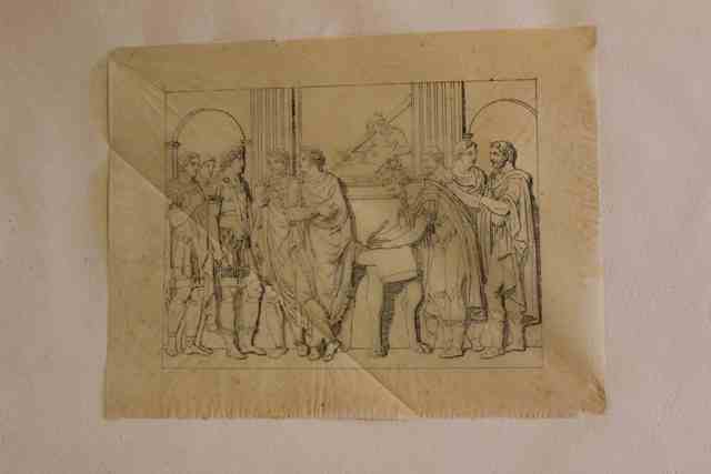 Studio per scena storica (Pace di Parigi). A penna e inchiostro nero su carta da lucido. Riquadrato a penna e inchiostro nero