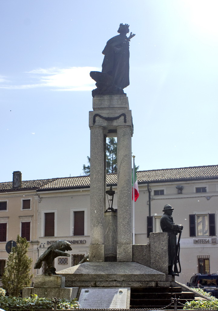 Monumento eretto sopra palco quadrangolare a gradini, sul quale si innalzano due coppie di colonne con basamento, fra le quali è collocato un tripode di bronzo. Le colonne sono concluse da due elementi di raccordo a dado, profilati a cornice, che sostengono la statua bronzea della Patria coronata, nell'atto di calpestare un drago e di sollevare con il braccio sinistro, cinto dello scudo, un ramo d'alloro; il braccio destro, posato lungo il fianco, tiene l'elsa di una spada poggiata a terra. Alla base delle colonne, un soldato di bronzo stante, in divisa invernale ed elmetto, tiene le mani sulla canna del fucile, poggiante a terra col calcio. Completano simmetricamente ai lati, due aquile bronzee ad ali spiegate, poggianti su piedistallo a dado