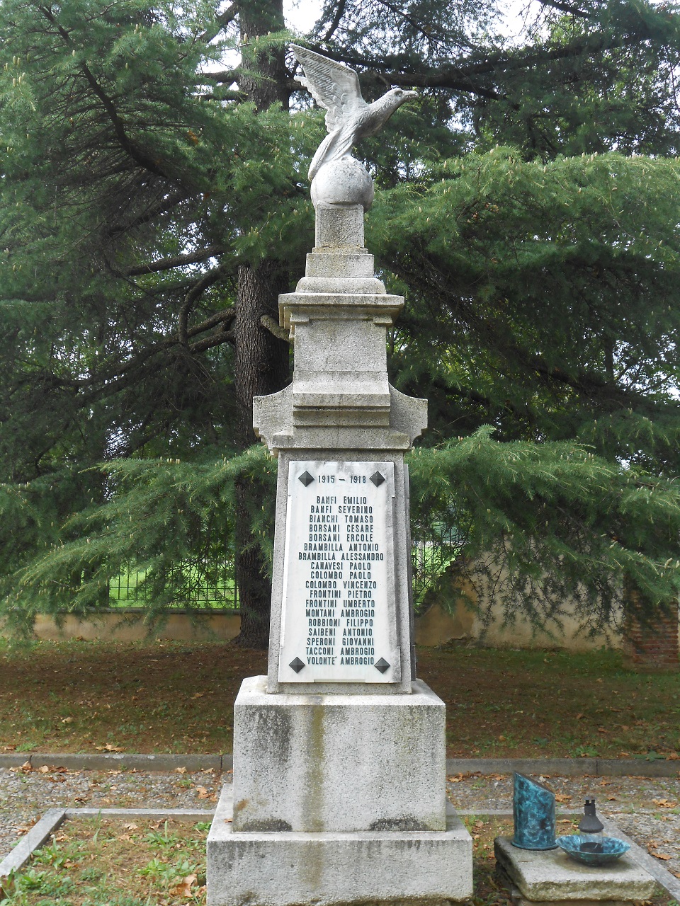un cippo, segnato da lapidi, è sormontato da una struttura dal profilo sagomato, conclusa da un'aquila che si poggia sopra una sfera. Base con dado sovrapposto a un gradino