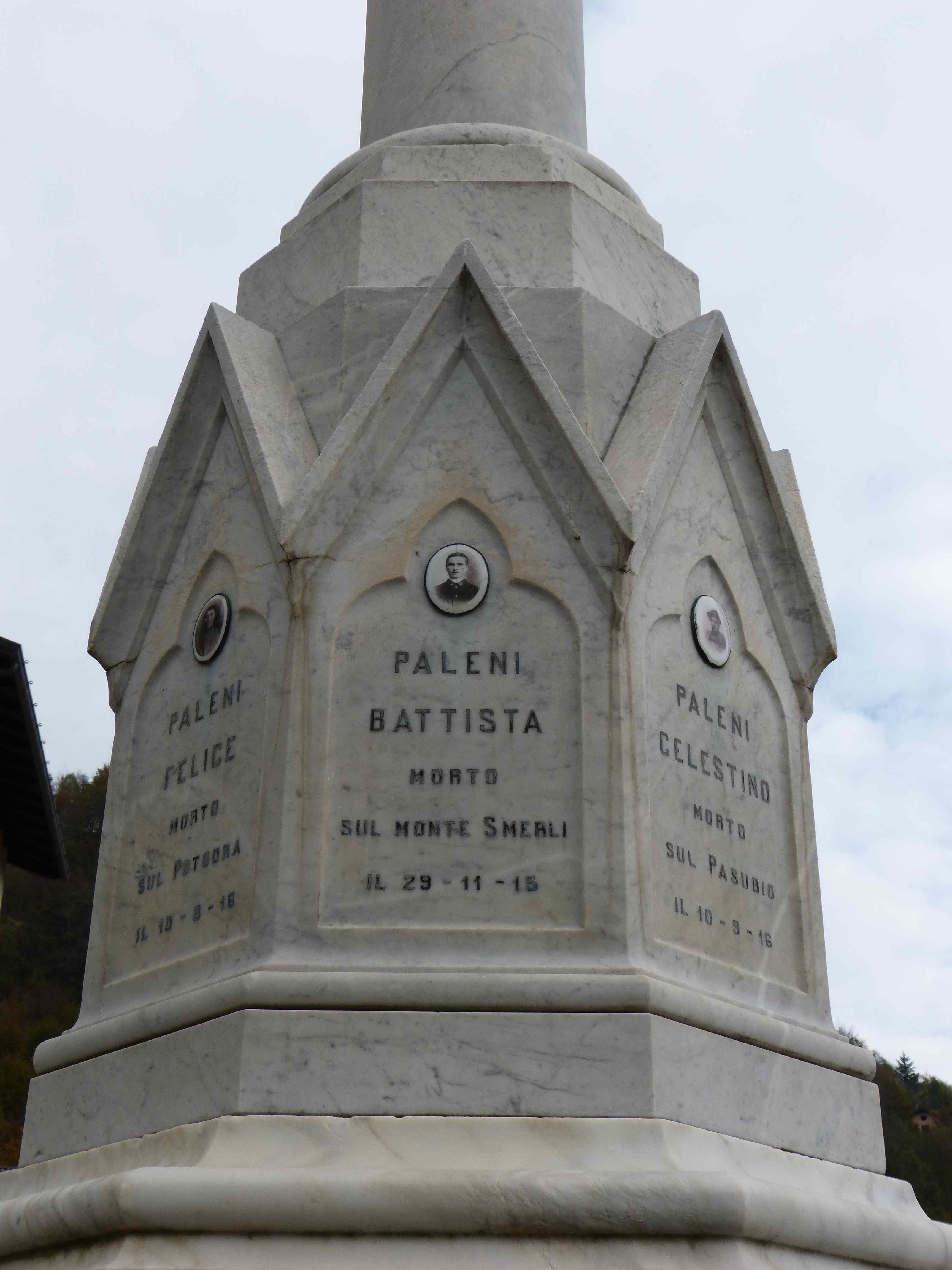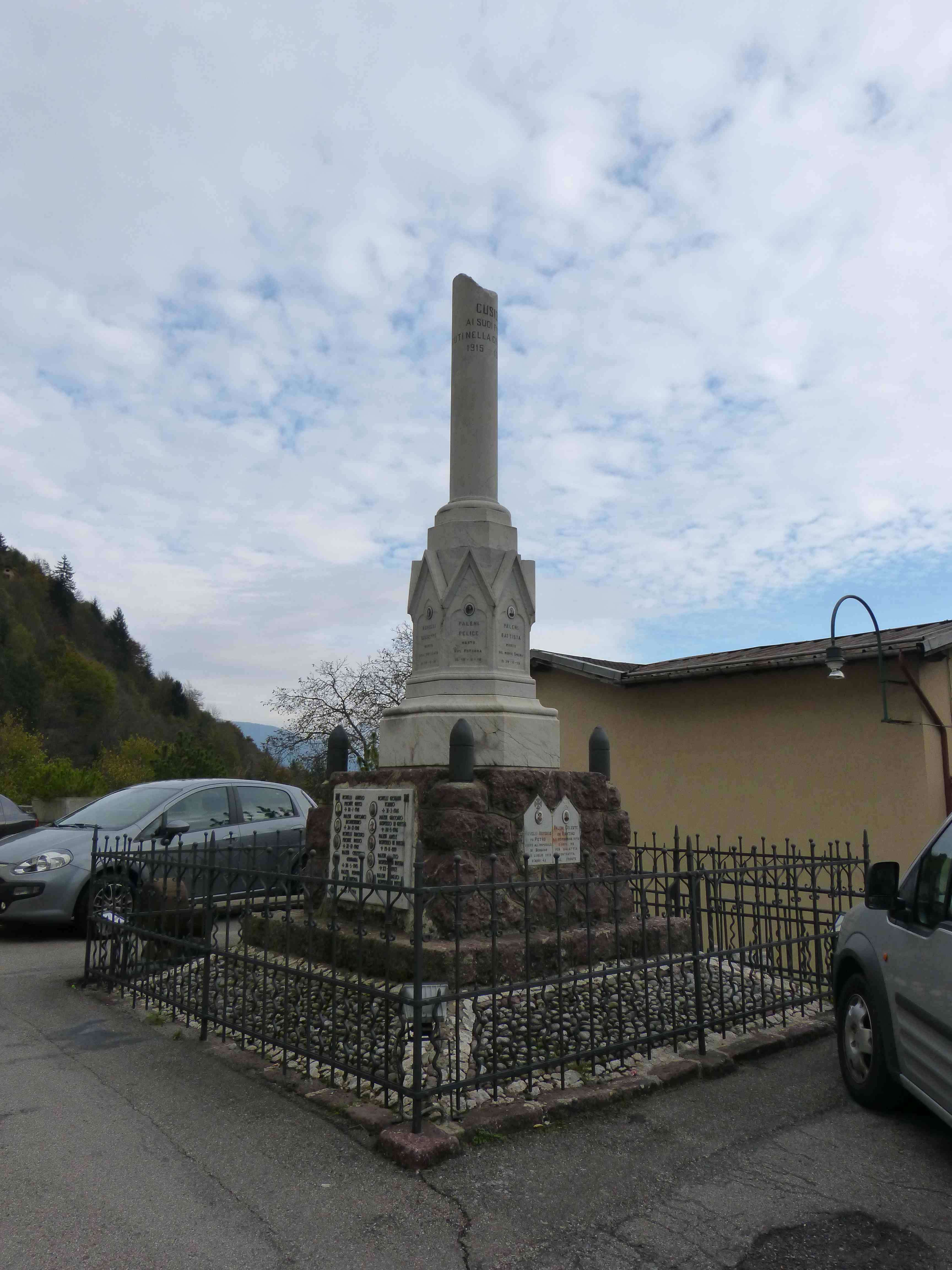 monumento ai caduti della prima guerra mondiale, a colonna spezzata su un basamento tronco di forma poligonale. Il basamento è in pietra squadrata decorato con pilastrini a forma di proiettile. Al basamento poligonale sono disposte delle lapidi sagomate a edicola che riportano i nomi e le fotografie dei caduti della prima guerra mondiale. Sul basamento sono stati aggiunti su du lapidi altri nomi