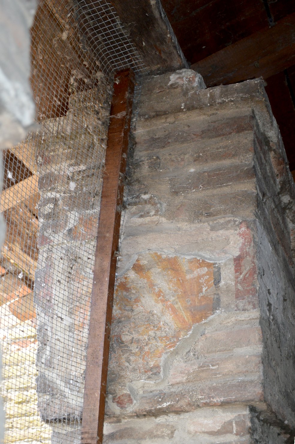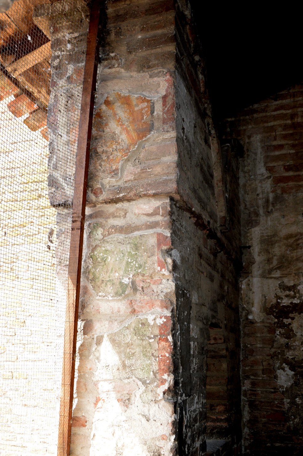 • NOTIZIE STORICO CRITICHE E’ nel camminamento meridionale del Castello di San Giorgio che fiancheggia le carceri destinate alle donne (già adibite ad alloggio per i secondini), che si conservano alcuni lacerti dell’originaria finitura decorativa che doveva ricoprire le merlature della struttura difensiva dovuta a Bartolino da Novara (attualmente non accessibile al pubblico). Le campiture dipinte nei colori araldici della casata Gonzaga sono ancora visibili presso i fianchi della parte terminale dei merli a coda di rondine: tali frammenti racchiudono un alto valore documentario, fondamentale per la ricostruzione di quello che doveva essere il primitivo aspetto dell’esterno del castello, non unicamente rifinito in laterizio a vista. La datazione proposta è indicativa e si riferisce alle fasi costruttive del maniero, voluto da Francesco I Gonzaga sullo scorcio del Trecento. In merito alla decorazione del camminamento, si riporta da L'Occaso-Rodella 2006: "I lacerti dei colori araldici dei Gonzaga dipinti sui merli del Castello di San Giorgio, da ritenersi con tutta probabilità coevi all'originaria costruzione e di cui permangono solo deboli tracce, anche negli ambienti interni, dovevano siglare, come veri e propri vessilli, la fondazione e la piena appartenenza della fortezza alla casata, rendendo così manifesti agli occhi degli esterni e dei cittadini i segni distintivi del potere signorile" (vedi BIB, p. 23)