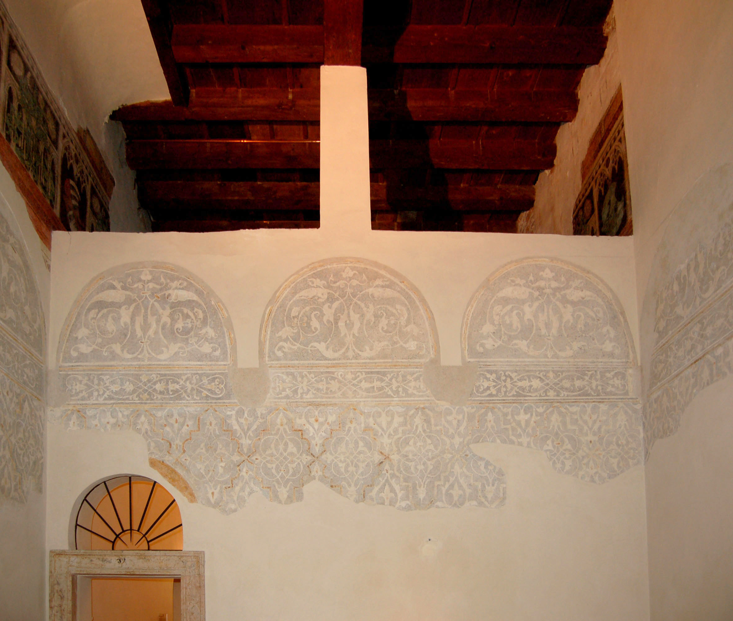 Il Secondo Camerino dorato presenta nella fascia superiore di tre pareti (sud, est e nord) un fregio pittorico compreso entro cornici. L’illusionistica impostazione architettonica del ciclo intervalla transenne impostate su una teoria di colonnine binate (cui si intreccia il bel motivo della calendula) a bifore gotiche. Nello spazio creato dagli archi a sesto acuto sono effigiati blasoni araldici, spesso perduti (di alcuni s’intuisce solo la sagoma); si conserva ancora però il metodo di fissaggio di tali scudi: nell’imposta d’arco comune delle bifore è conficcato un chiodo, prospetticamente illusorio, cui si appende lo stemma sottostante. Si segnala che oltre la parete ovest, tramezzo messo in opera durante il riallestimento commissionato da Isabella d’Este, è visibile la prosecuzione del fregio tardogotico nella stanza attigua (Primo Camerino dorato, B0-43, si veda l'ultima immagine allegata), che formava originariamente con la presente, un unico ambiente (nello stanzino citato il fregio alto è occluso dalla controsoffittatura voluta dalla marchesa)