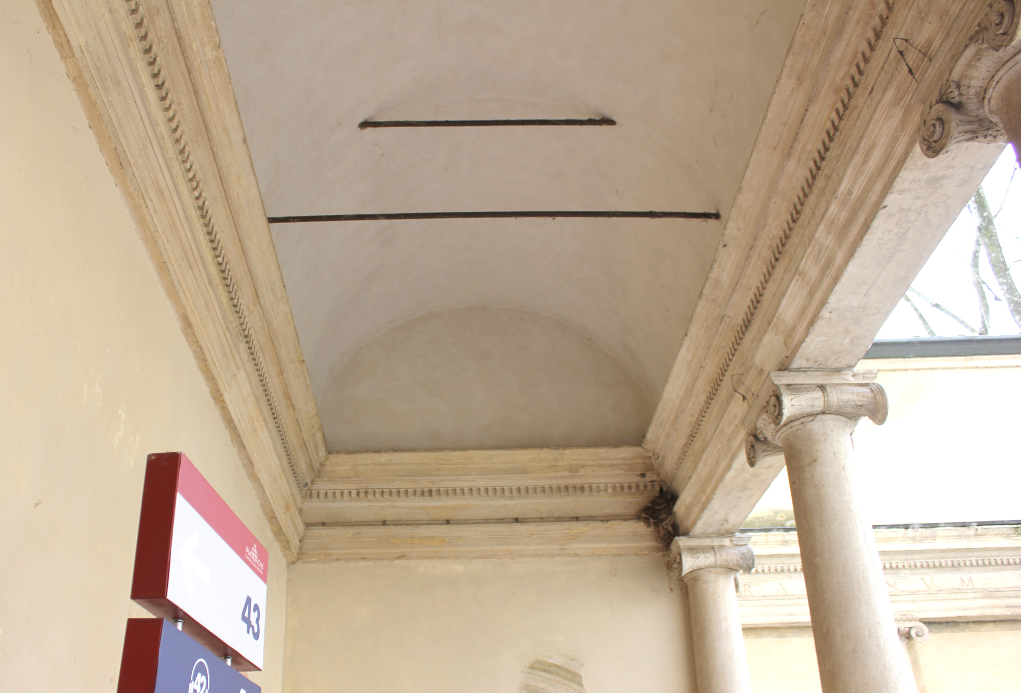 La volta a botte della Loggia del Giardino segreto prevede all’imposta una spessa cornice trabeata che corre lungo l’intero perimetro del vano; tale elemento rispecchia il medesimo disegno della trabeazione del cortile, privo soltanto dell’iscrizione incisa nella fascia del fregio. Lo sviluppo della cornice per sottili modanature porta al terminale con ovolo e cavetto, sui quali si imposta il listello cui aderisce il fregio, completamente liscio; al di sopra corre una fascia dentellata chiusa al vertice dalla cornice superiore di forte aggetto