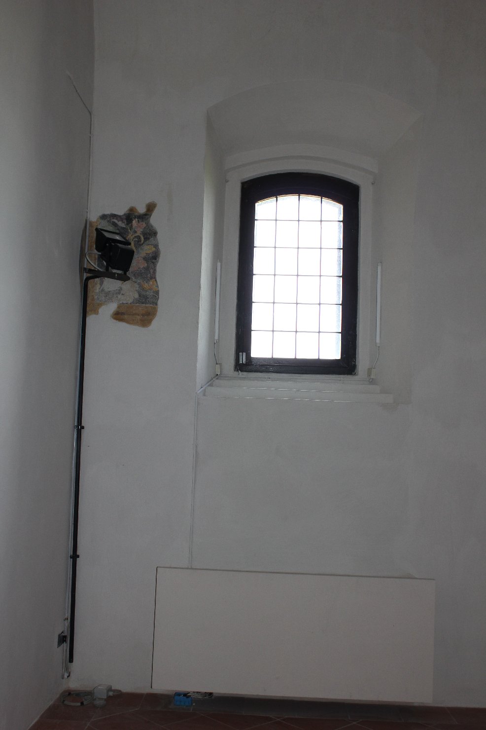 All’altezza della finestra in corrispondenza dell’angolo nord-est dell’ambiente A0,15 è presente un lacerto pittorico piuttosto esiguo e rovinato; una cornice dorata su tre lati limita quello che pare essere un fregio policromo con girali fitomorfi che si svolgono su di uno sfondo scuro. Superato il vertice dell’angolo, la cornice e il fondo proseguono per un breve tratto: in origine il fregio doveva correre probabilmente anche sul lato settentrionale