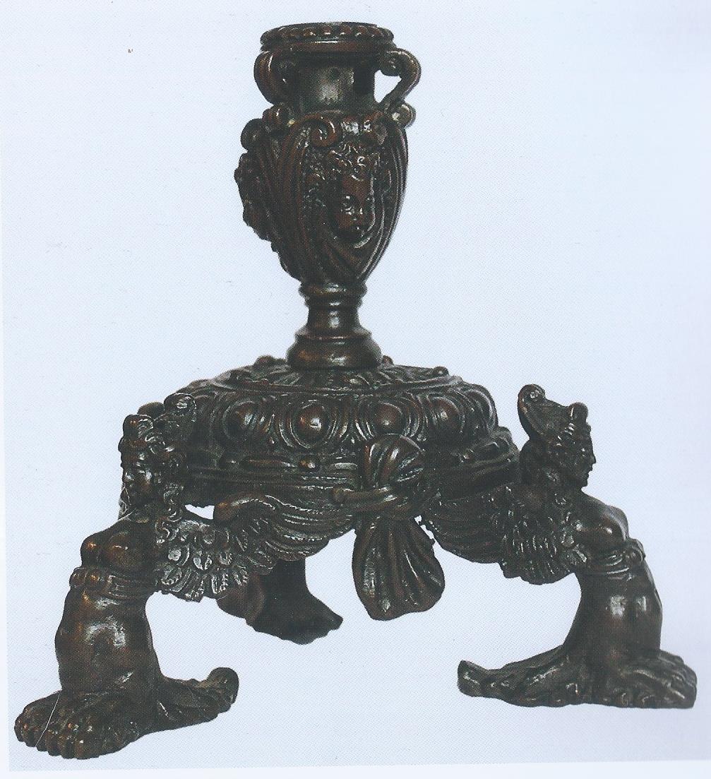 - NOTIZIE STORICO CRITICHE Il pezzo in esame è identico in ogni dettaglio a una coppia di bronzi della collezione Kress e del Kunsthistorisches Museum di Vienna (invv. 5941, 5949). Un altro è stato venduto da Christie's a Londra nel 2006 (7 dicembre 2006, lotto 180) con un riferimento alla bottega di Roccatagliata. Un esemplare simile, ma privo del coperchio, si conserva a Vicenza (Victoria Avery rimane incerta se attribuirlo alla bottega di Giuseppe de Levis da Verona o a Roccatagliata)