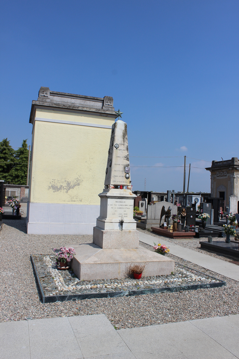 monumento ai caduti della prima e della seconda guerra mondiale: stele sormontata da una stella d'Italia e poggiante su basamento con riportati sulle facce i nomi dei caduti con fotografia