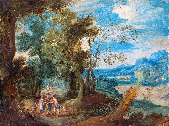 - NOTIZIE STORICO CRITICHE La tecnica esecutiva con la minuzia nella descrizione del fogliame rinvia alla cultura fiamminga. Già don Giovanni Bellini aveva indicato per la presente opera il nome di David Vinckboons; l’attribuzione trova qualche fondamento tanto che è probabile che il dipinto su rame sia da ricondurre a un seguace del maestro fiammingo operoso sul finire del Seicento. Non è stata tuttavia individuata l’opera da cui il presente dipinto è stato tratto