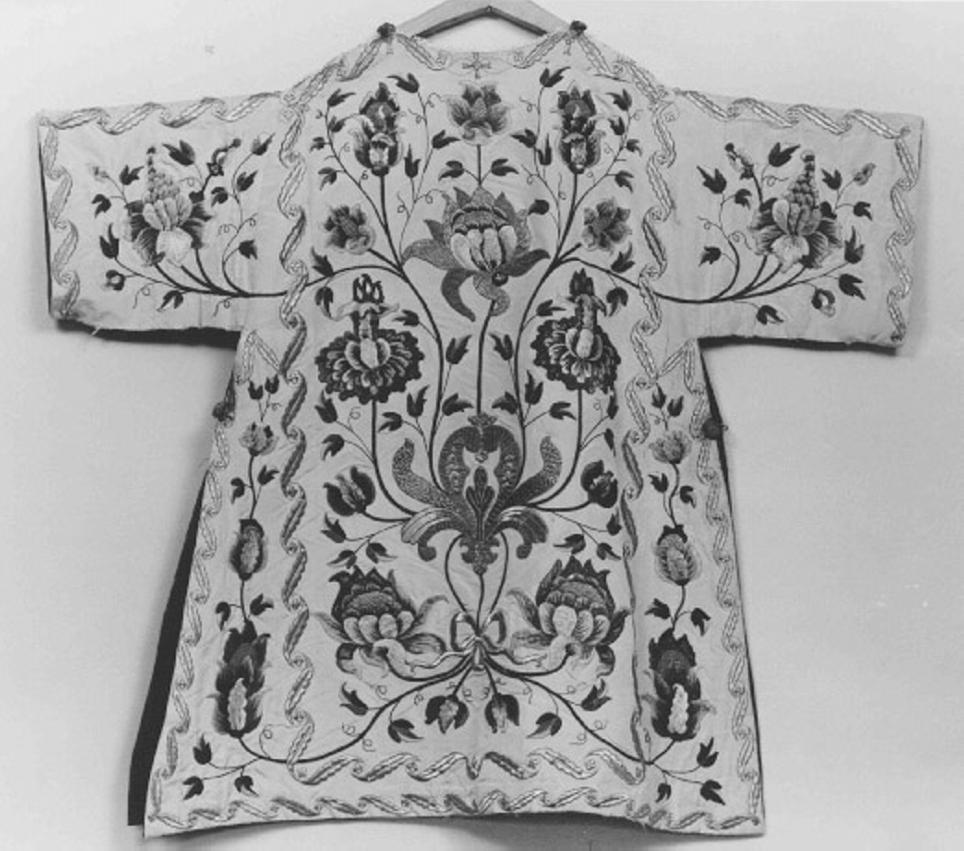 Seta verde broccata. Galloni argentati. Fodera di seta verde. Motivi a tralci floreali che culminano in mazzi di rose