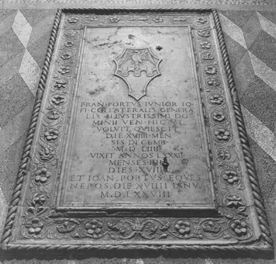 - ISCRIZIONI Al centro - FRAN. PORTUS. IUNIOR. IO FI. COLLATERALIS. GENERA LIS ILLUSTRISSIMI. DO MINI VEN. HIC. VT. VOLVIT QUIESCIT DIE. XVIIII MEN. SIS DECEM. M DLIIII. VIXIT ANNOS LXXXII MENSES IIII DIES XVIIII. ET IOAN. PORTUS. EQUES NEPOS. DIE XVIIII. IAVN. M. D. L. XXVIII -