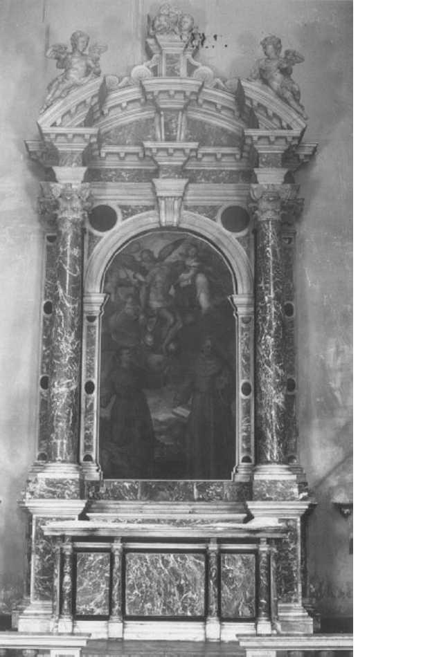 Su tre gradini si imposta il dossale con due colonne con capitelli corinzi, alle cui spalle e' una coppia di paraste con intarsi. Davanti e' la mensa. Trabeazione e timpano curvilineo spezzati e decorati da dentelli