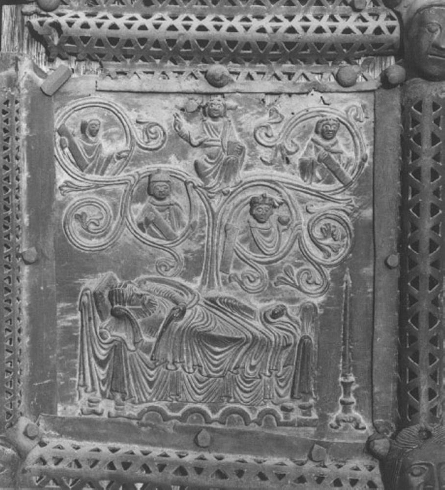 Personaggi: Jesse; Gesù Cristo. Figure maschili: busti maschili. Allegorie-simboli: albero genealogico di Cristo. Mobilia: letto