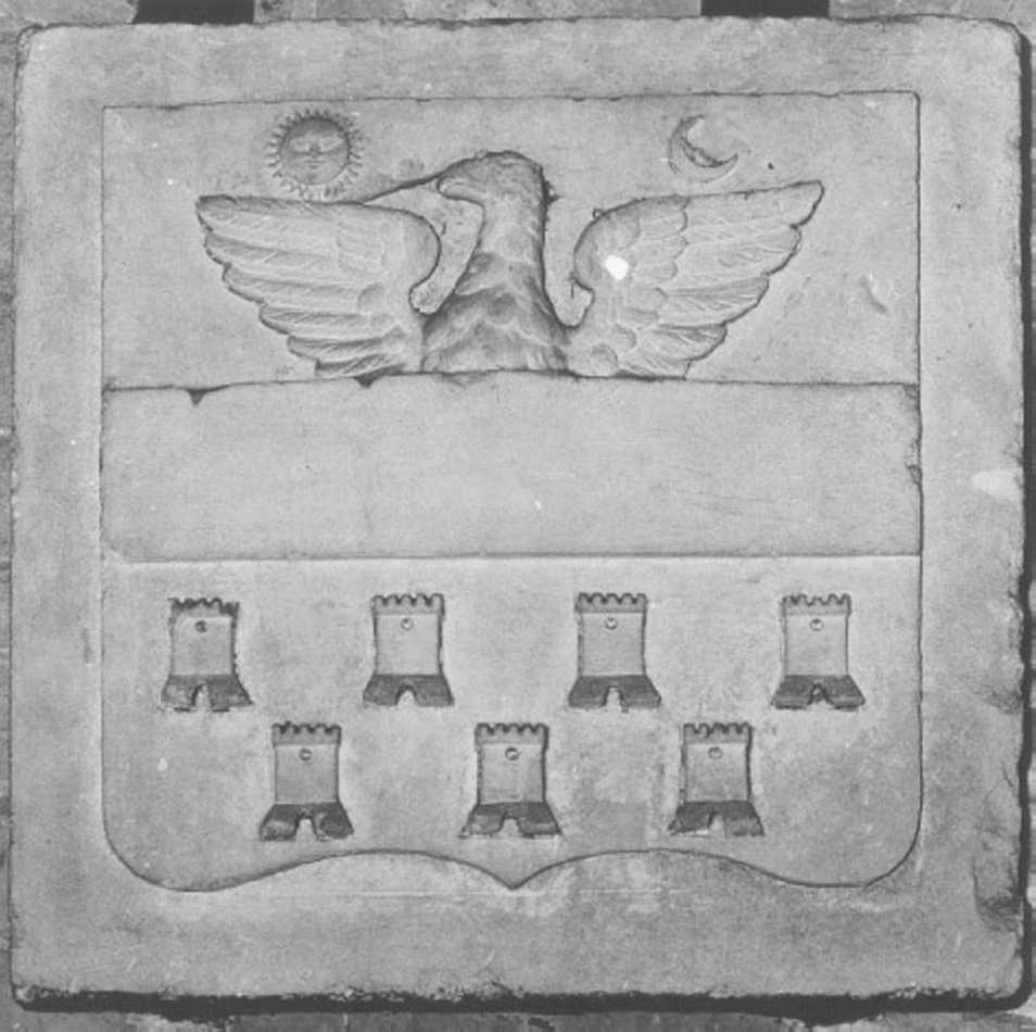 - STEMMI gentilizio - Stemma - Troncato da una fascia nel primo all'aquila nascente della fascia accantonata in capo dal sole e dalla luna, nel secondo sette torri