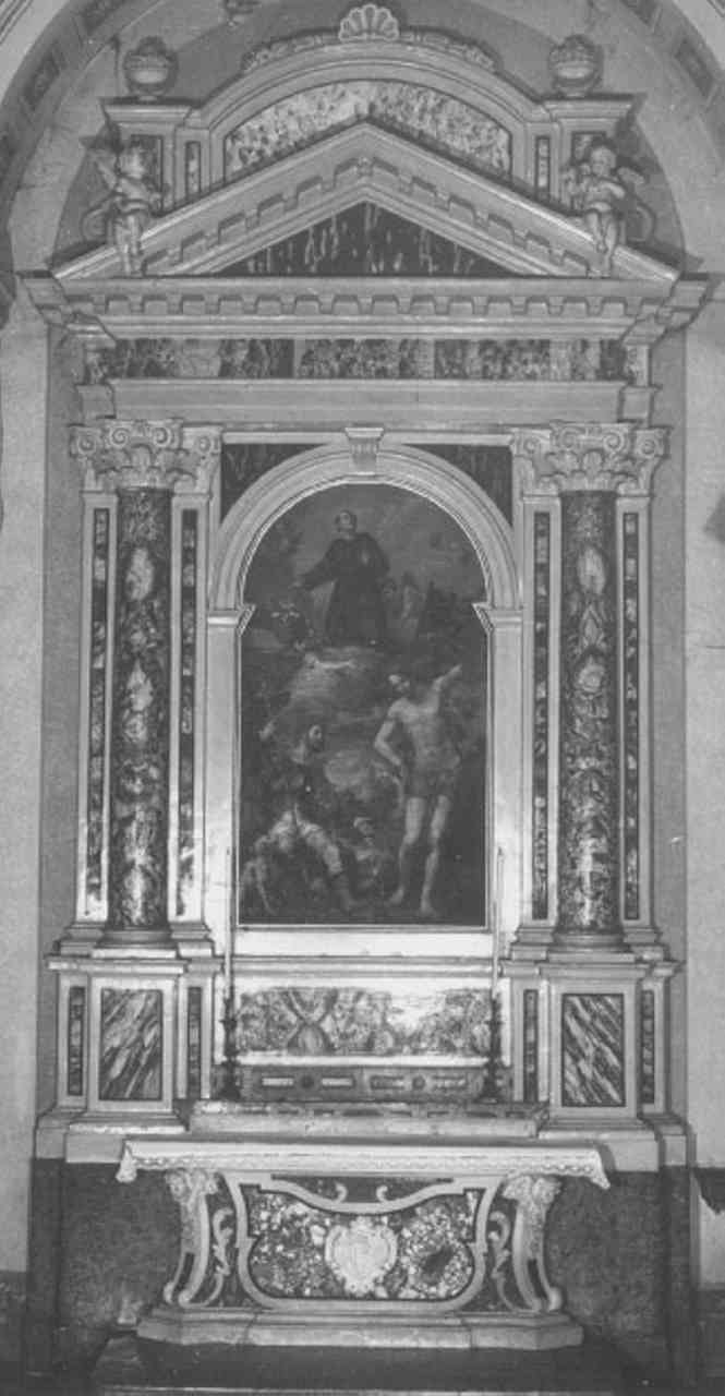 Elemento a profilo rettangolare. Colonne a fusto liscio con capitelli compositi. Trabeazione alta con fastigio a padiglione in marmi policromi