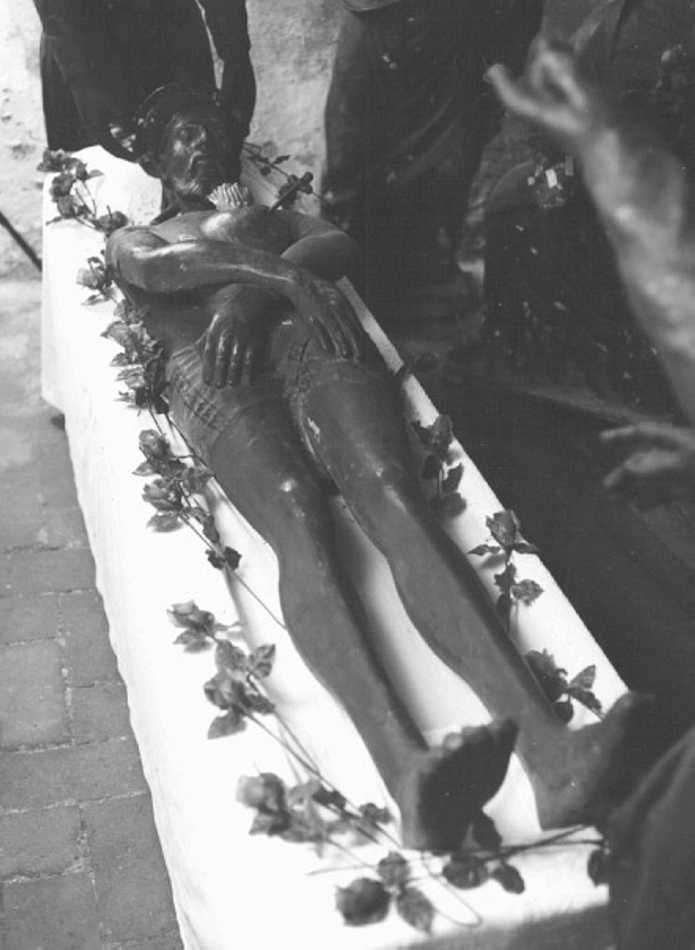 - NOTIZIE STORICO CRITICHE Il tema popolare del Compianto, apocrito rispetto alla tradizione evan- gelista e' presente in Italia dall'inizio del '300 proveniente da area culturale bizantina, e' qui' redatto da artista non eccelso, presumibil- mente veronese entro la meta' del '400. I personaggi sono per tipo e numero quelli fissati dalla tradizione, pur se la loro posizione e' alterata, con l'aggiunta probabilmente ottocentesca di quattro sagome di soldati sullo sfondo. E' possibile stabilire un parallelo con analo- ghi gruppi scultorei in ambito veronese, come il compianto di S. Fermo (attr. a Giovanni di Ringino)