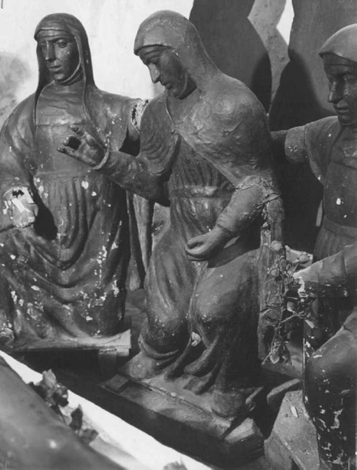- NOTIZIE STORICO CRITICHE Il tema popolare del Compianto, apocrito rispetto alla tradizione evan- gelista e' presente in Italia dall'inizio del '300 proveniente da area culturale bizantina, e' qui' redatto da artista non eccelso, presumibil- mente veronese entro la meta' del '400. I personaggi sono per tipo e numero quelli fissati dalla tradizione, pur se la loro posizione e' alterata, con l'aggiunta probabilmente ottocentesca di quattro sagome di soldati sullo sfondo. E' possibile stabilire un parallelo con analo- ghi gruppi scultorei in ambito veronese, come il compianto di S. Fermo (attr. a Giovanni di Ringino)