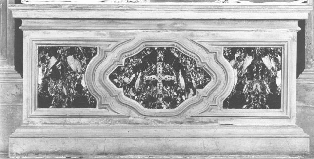 Su uno zoccolo modanato poggia il paliotto rettangolare in marmo grigio con cornice. Al centro scolpita a bassorilievo è una croce con braccia uguali formata da foglie d'acanto, inserita in una specchiatura mistilinea in marmo bianco delimitata da una doppia cornice modanata