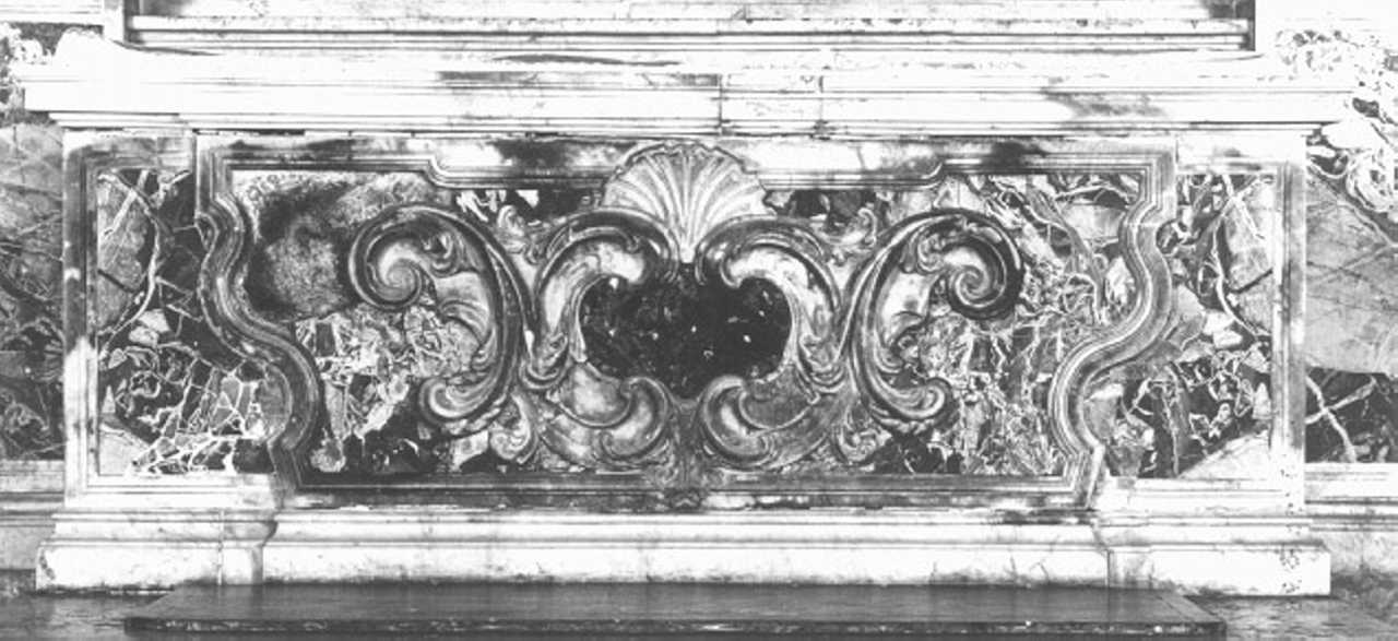 Paliotto rettangolare in marmo rosso con al centro un corpo leggermente avanzato delimitato da una cornice sagomata mistilinea in marmo bianco contenente una specchiatura in marmo verde contornata di volute e sormontate da una conghiglia scanalata