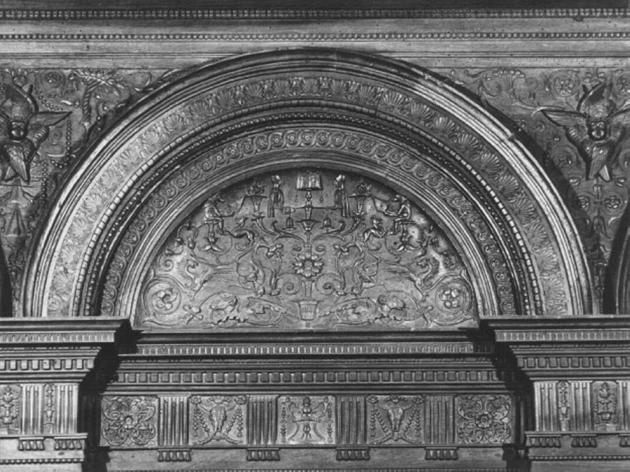 Decorazioni: conchiglie; dentelli; ovoli; doppio nastro intrecciato; rosette; candelabra; girali. Animali fantastici: scimmie. Figure