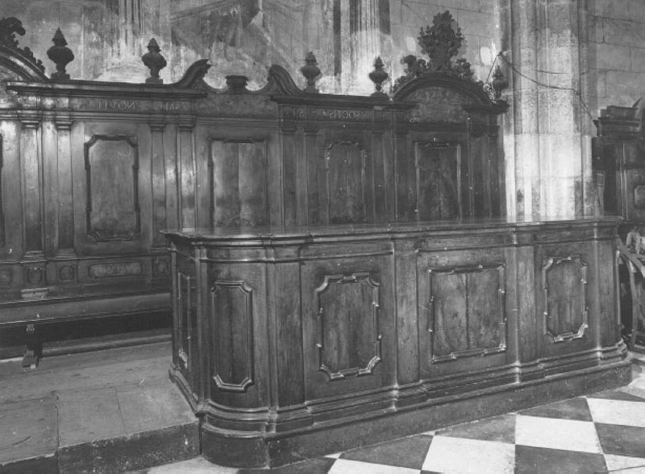 - NOTIZIE STORICO CRITICHE I confessionali e le panche con dorsale e con bancone collocati lungo le navate appartengono alla bottega artigiana. Essi presentano una concezione architettonica e stilemi tipici della seconda meta' del '600, ma i ricchi elementi decorativi dei profili superiori e i sostegni sagomati nei sedili confermano una datazione spostata al XVIII secolo. Una delle panche e' datata 1730, un'altra 1738