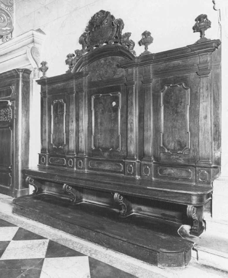 Sostegni a volute scanalate, schienale suddiviso in tre parti da lesene toscane, con specchiature rettangolari a contorni mistilinei, architrave con frontone semicircolare al centro, profilo superiore decorato