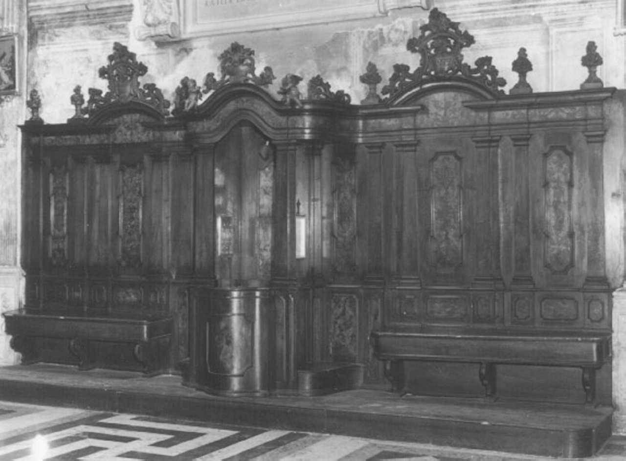 - NOTIZIE STORICO CRITICHE I confessionali e le panche con dorsale e con bancone collocati lungo le navate appartengono alla bottega artigiana. Essi presentano una concezione architettonica e stilemi tipici della seconda meta' del '600, ma i ricchi elementi decorativi dei profili superiori e i sostegni sagomati nei sedili confermano una datazione spostata al XVIII secolo. Una delle panche e' datata 1730, un'altra 1738