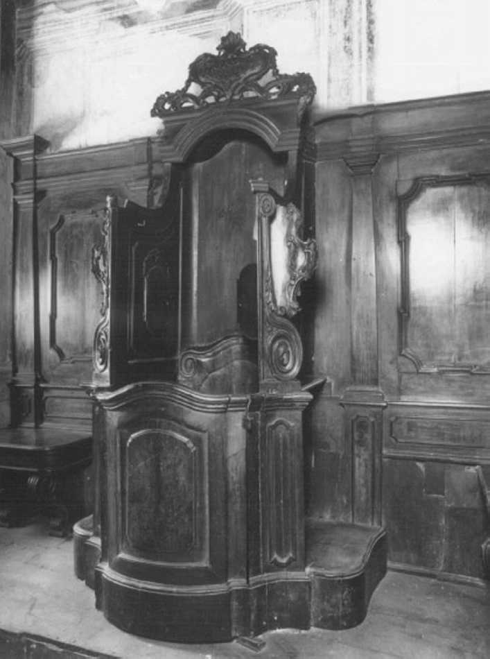 Confessionale : sportello bombato, volute sostenenti architrave con profilo superiore decorato. Seggio laterale : sostegni a volute scanalate, schienale con spec- chiatura centrale tra lesene sostenenti architrave -