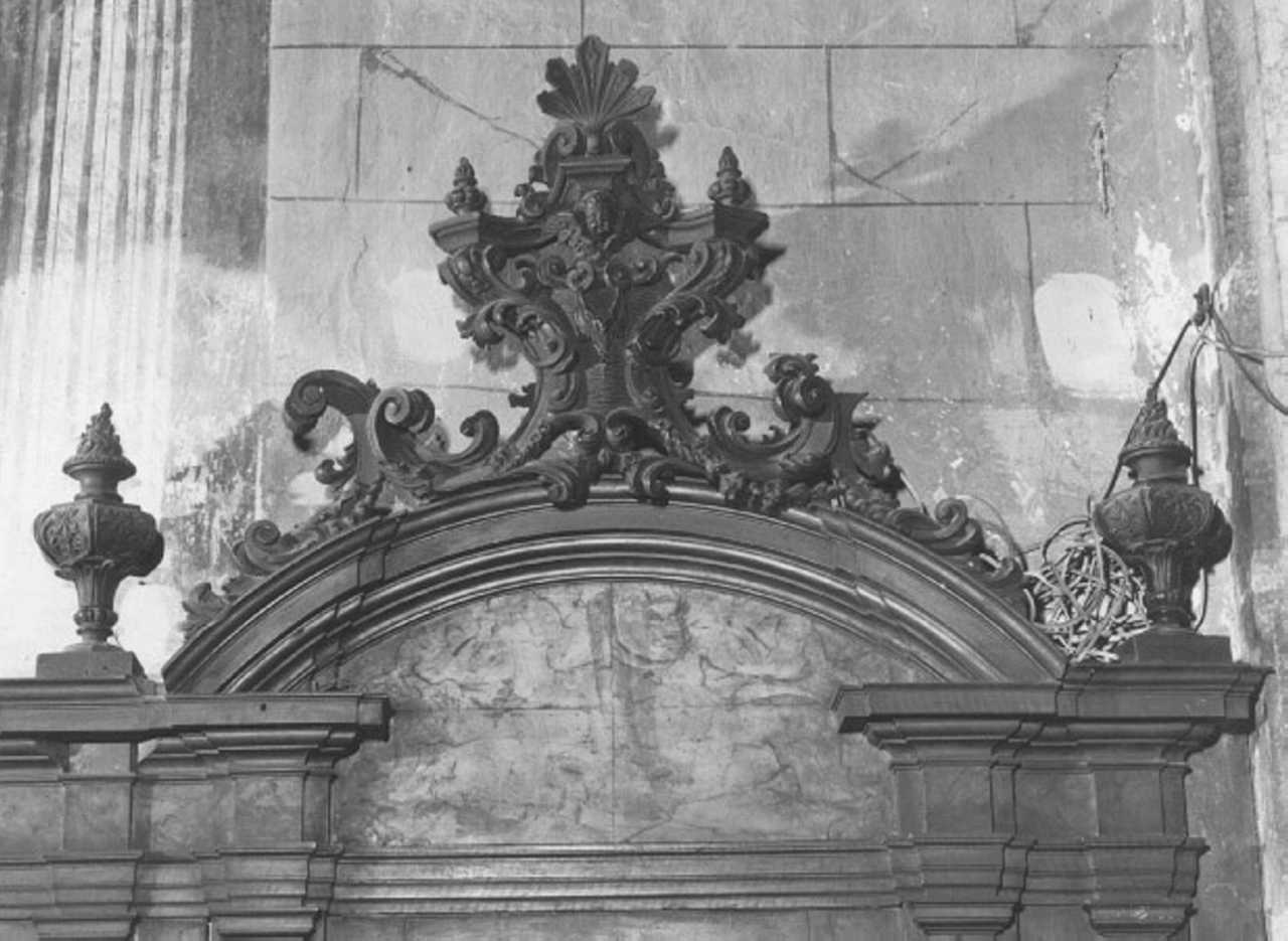 Cartiglio con motivi fitomorfi, vasi con fiamma, testina fastigio, schienale di sinistra