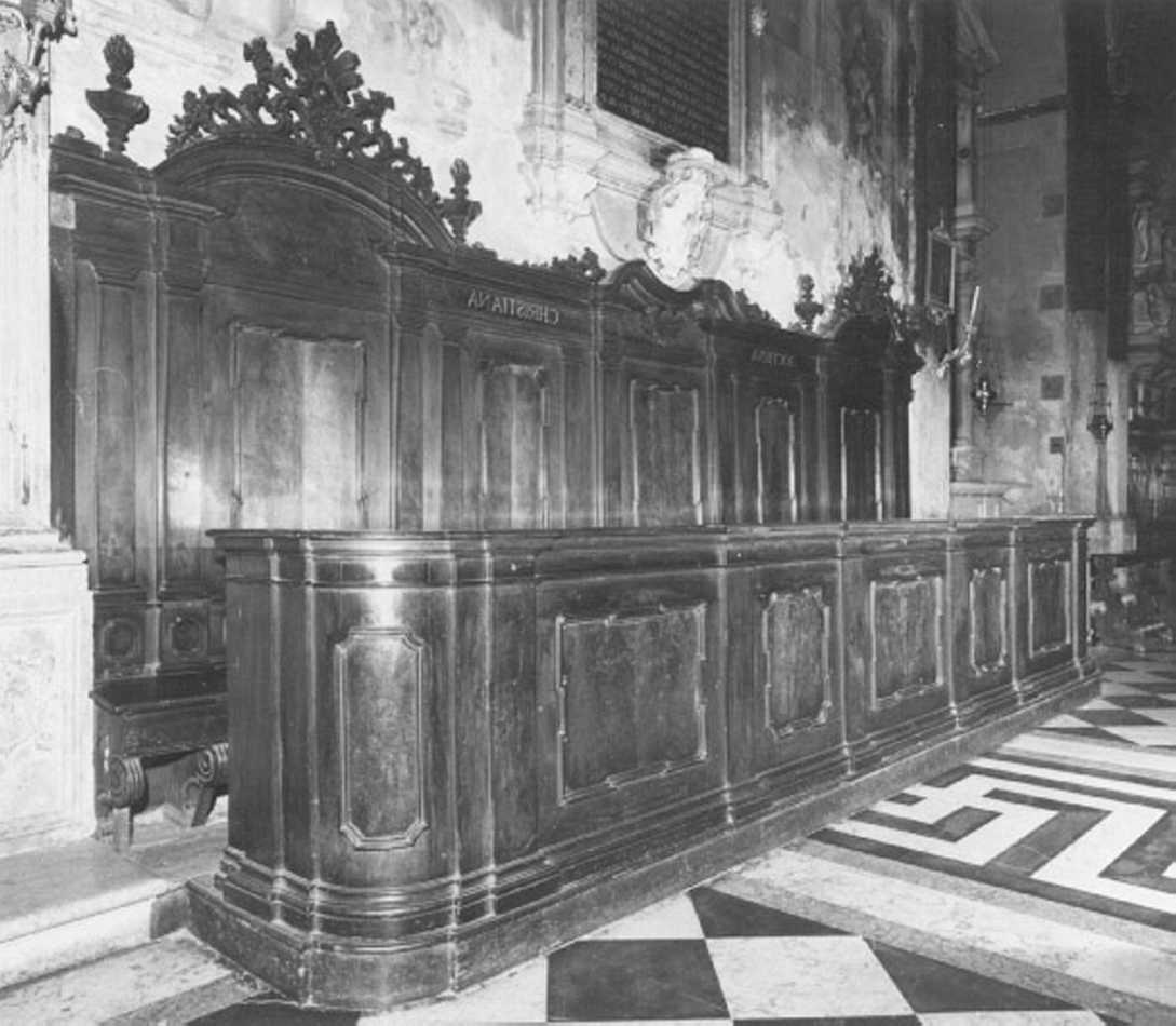 - NOTIZIE STORICO CRITICHE I confessionali e le panche con dorsale e con bancone collocati lungo le navate appartengono alla bottega artigiana. Essi presentano una concezione architettonica e stilemi tipici della seconda meta' del '600, ma i ricchi elementi decorativi dei profili superiori e i sostegni sagomati nei sedili confermano una datazione spostata al XVIII secolo