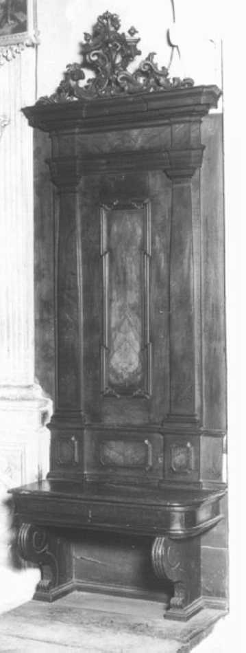 - NOTIZIE STORICO CRITICHE I confessionali e le panche con dorsale e con bancone collocati lungo le navate appartengono alla bottega artigiana. Essi presentano una concezione architettonica e stilemi tipici della seconda meta' del '600, ma i ricchi elementi decorativi dei profili superiori e i sostegni sagomati nei sedili confermano una datazione spostata al XVIII secolo. Una delle panche e' datata 1730, un'altra 1738