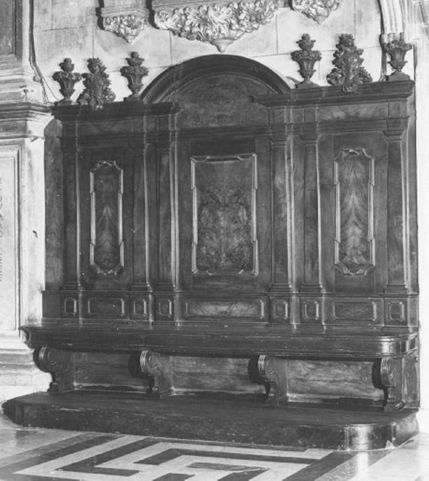 - NOTIZIE STORICO CRITICHE I confessionali e le panche con dorsale e con bancone collocati lungo le navate appartengono alla bottega artigiana. Essi presentano una concezione architettonica e stilemi tipici della seconda meta' del '600, ma i ricchi elementi decorativi dei profili superiori e i sostegni sagomati nei sedili confermano una datazione spostata al XVIII secolo. Una delle panche e' datata 1730, un'altra 1738. Per i rilievi che decorano il profilo superiore cfr. livello 7.1 -