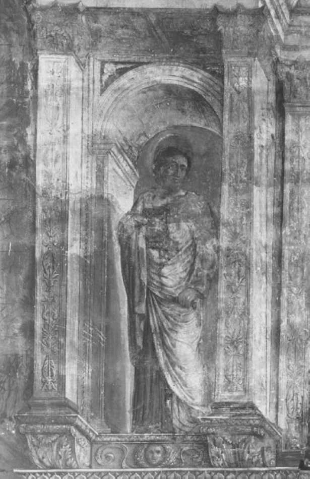 - NOTIZIE STORICO CRITICHE Gli studi piu' recenti ritengono gli affreschi coevi all'erezione della cappella. Le pareti della cattedrale furono imbiancate nel 1698 e nel 1755. Tra il 1868 e il 1870 lo scialbo fu rimosso, in modo troppo radicale, dal pittore P. Nanin. L'opera e' attribui- bile a un pittore veneto di influsso mantegnesco. Esiste una for- te consonanza stilistica tra gli affreschi della prima e della ter- za cappella a sinistra, entrambe della famiglia Cartolari