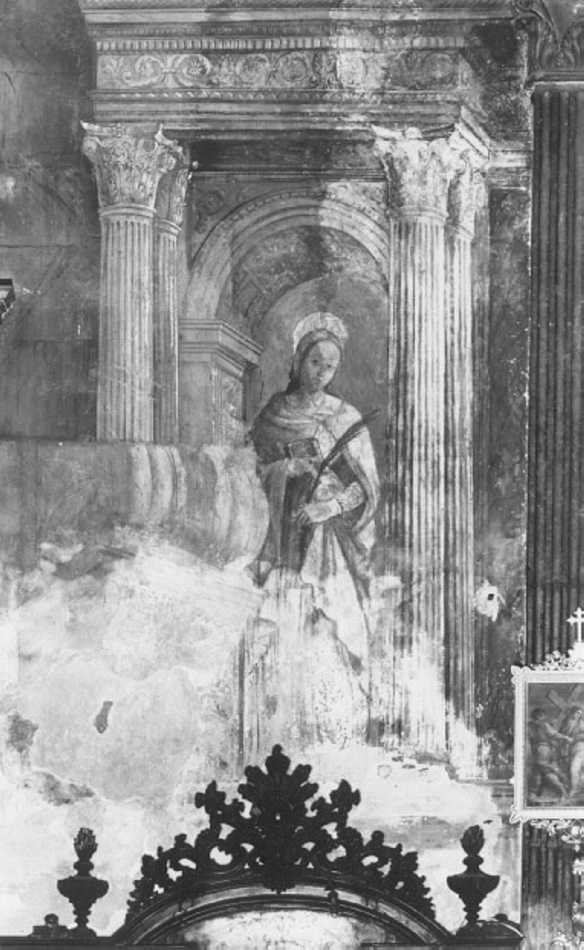 - NOTIZIE STORICO CRITICHE Gli studi piu' recenti ritengono gli affreschi coevi all'erezione della cappella. Le pareti della cattedrale furono imbiancate nel 1698 e nel 1755. Tra il 1868 e il 1870 lo scialbo fu rimosso, in modo troppo radicale, dal pittore P. Nanin. L'opera e' attribui- bile a un pittore veneto di influsso mantegnesco. Esiste una for- te consonanza stilistica tra gli affreschi della prima e della ter- za cappella a sinistra, entrambe della famiglia Cartolari