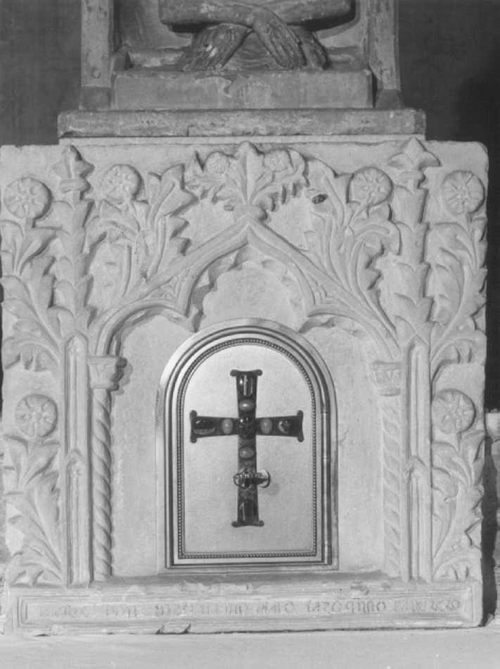 - NOTIZIE STORICO CRITICHE Da Lisca avanza l'ipotesi che in origine l'altare fosse collocato in un'abside, demolito in occasione dei restauri cinquecenteschi. L'esterno della muratura di fondo della chiesa non mostra tuttavia tracce di di- scontinuita' nei corsi in pietra e le iscrizioni del 1562 e 1571 rela- tive ai lavori, non accennano ad un'abside. La decorazione a fresco, ri- salente al 1562, del muro di fondo si sovrappone a un precedente intona- co ed e' stata eseguita quando alla parete gia' era addossato l'altare maggiore gotico, di cui contornava la sagoma, ancora visibile rimuovendo la pala di M.A. Bassetti. Pertanto e' quando venne posta quest'ultima, nel 1627 - 28, che l'altare fu staccato dal muro e risistemato nella forma presente. Nella precedente disposizione l'attuale paliotto - come e' stato notato da Meneghin e come mostra la sagoma sulla parete - era un dossale al di sopra della mensa. La silhoutte indica inoltre che il dossale recava alla sommita' tre edicole. Solo quella al centro dell'al- tare attuale, con il Cristo Morto, vi si trovava ai tempi di Da Lisca, mentre le altre poggiate su una balaustra presbiteriale, ora non piu' esistente. Negli anni '70 del novecento il tabernacolo murale quattro- centesco che era posto sulla parete destra del presbiterio e stato stac- cato e posto sulla mensa. I rilievi che possono essere collegati al dossale gotico (paliotto piu' cinque edicole) sono stati datati al XV secolo da L. Simeoni, alla fine del XIV da L. Magagnato, che li assegna a scultore prossimo ad Antonio da Mestre, mentre G. Mazzi rileva i lega- mi del paliotto con la cornice lignea del polittico della Trinita', fir- mato e datato da Turone di Maxio da Cammago nel 1360 Nell'opera devono essere distinte due diverse mani: la prima ha eseguito il paliotto e l'Angelo Annunciante, la cui veste e acconciatura si ri- trovano nella pittura veronese tra il XIV e XV secolo (Annunciazione di Martino da Verona in S. Stefano); alla seconda mano, che cura assai meno i dettagli, va riferita la Vergine Annunciata e il Cristo Morto, nonche' altre due edicole con santi monaci attualmente (1988) poste in nicchie nella parete destra del presbiterio