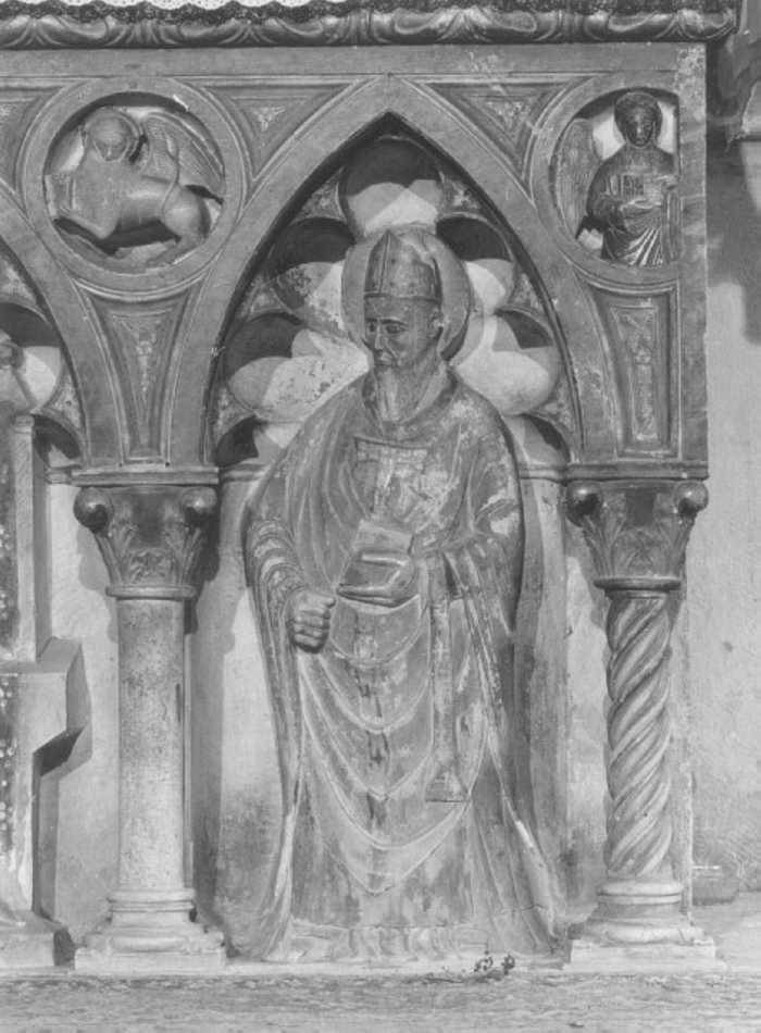 Rilievo con Santo vescovo vestito con mitria e pianeta, con libro, entro edicola polilobata delimitata da un arco a sesto acuto su due colonnine