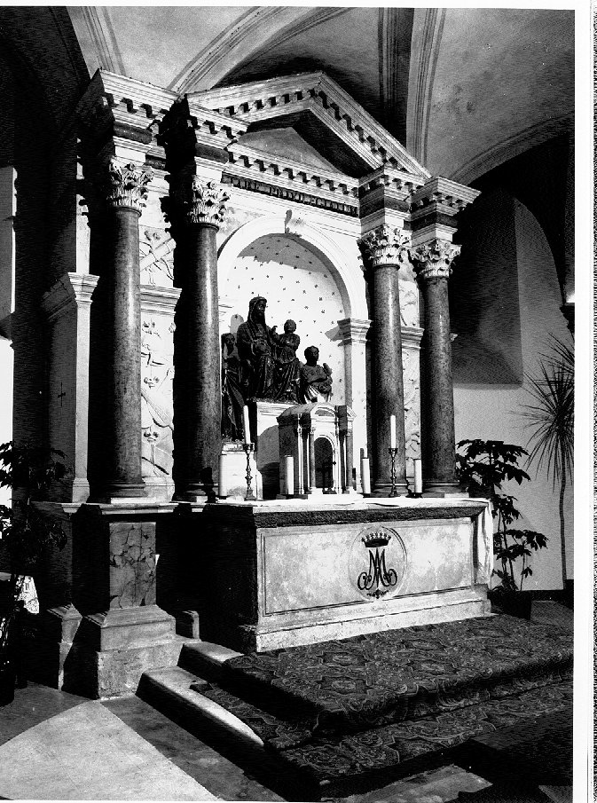 - NOTIZIE STORICO CRITICHE Si tratta, con ogni probabilità, dell'altare di S. Dionisio eretto p er volontà del vescovo Dionisio Dolfin entro il 1613, anno nel quale vennero completati i lavori di restauro della cripta iniziati nel 1 605. L'altare, che recava una pala perduta dei Maganza (Boschini, 16 76), era stato costruito con i marmi provenienti dal distrutto teatr o Berga di Vicenza. Lavoro di maestranze locali, l'altare conservava per il Barbarano (1761) delle reliquie donate dal cardinale Federic o Cornaro. Intorno alla metà del XIX secolo è stato collocato, in so stituzione dell'originaria pala, il gruppo scultoreo della "Madonna moretta"