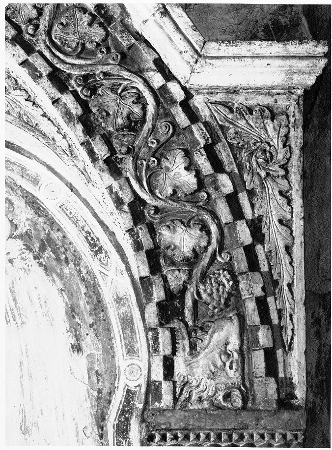 Decorazione: motivo continuo a tralci di vite e grappoli d'uva, usce nte dalle fauci di due leoni. Fondo blu. Cornice: a dentelli, sui bo rdi esterni
