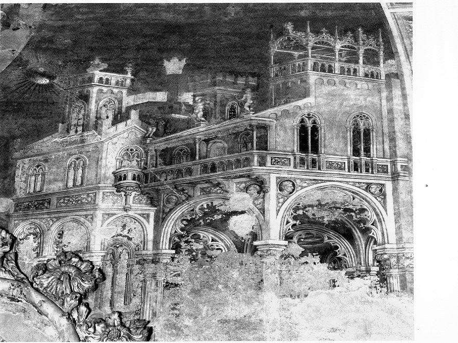 - NOTIZIE STORICO CRITICHE Il complessodella pittura murale, realizzatocome un fondale dipintoa completare e integrare il monumentofunebre di Cortesia Serego, ha evi- denti derivazioni dal monumentoBrenzoni di San Fermoe dall'Annuncia- zione dipintavi dal Pisanello. Rispettoa Pisanellosi nota pero' in Giambonoun gustopiu' narrativoe menofreddo, riscontrabile tra l'altronell'espressione vivace dei volti e nei maggiori effetti di movimento. La decorazione ha avutouna lunga e contrastata vicenda attributiva giunta a soluzione con l'Arslan, che l'assegna al Giambonomuovendodal confrontocoi mosaici dellostessopittore nella Cappella dei Mascoli in San Marcoa Venezia. L'opera, riferibile alla prima maturita' del Giambono, mostra elementi tipici del gustocortese accantoad accenti invece ormai quasi umanisti- ci. L'architettura faceva da sfondoalla Madonna Annunciata, la cui scom- parsa e' annotata gia' dal De Lisca che rileva anche ampi rifacimenti (ora rimossi). Notevoli sonoi ritratti racchiusi entromedaglioni rotondi e i putti con archi collocati sui pinnacoli. Elementi di gustoumanisticosi contrappongonoad altri di gustocortese