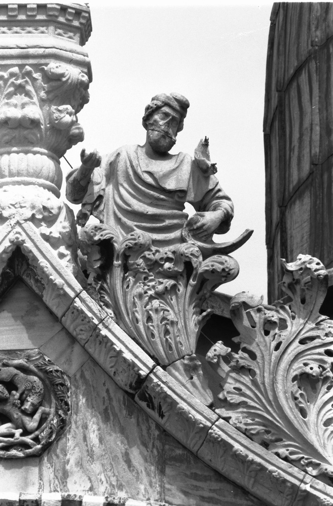 Questa mezza figura ha il volto molto rovinato, il cartiglio che teneva nella mano destra è quasi totalmente perduto. Ha il capo coperto da un berretto