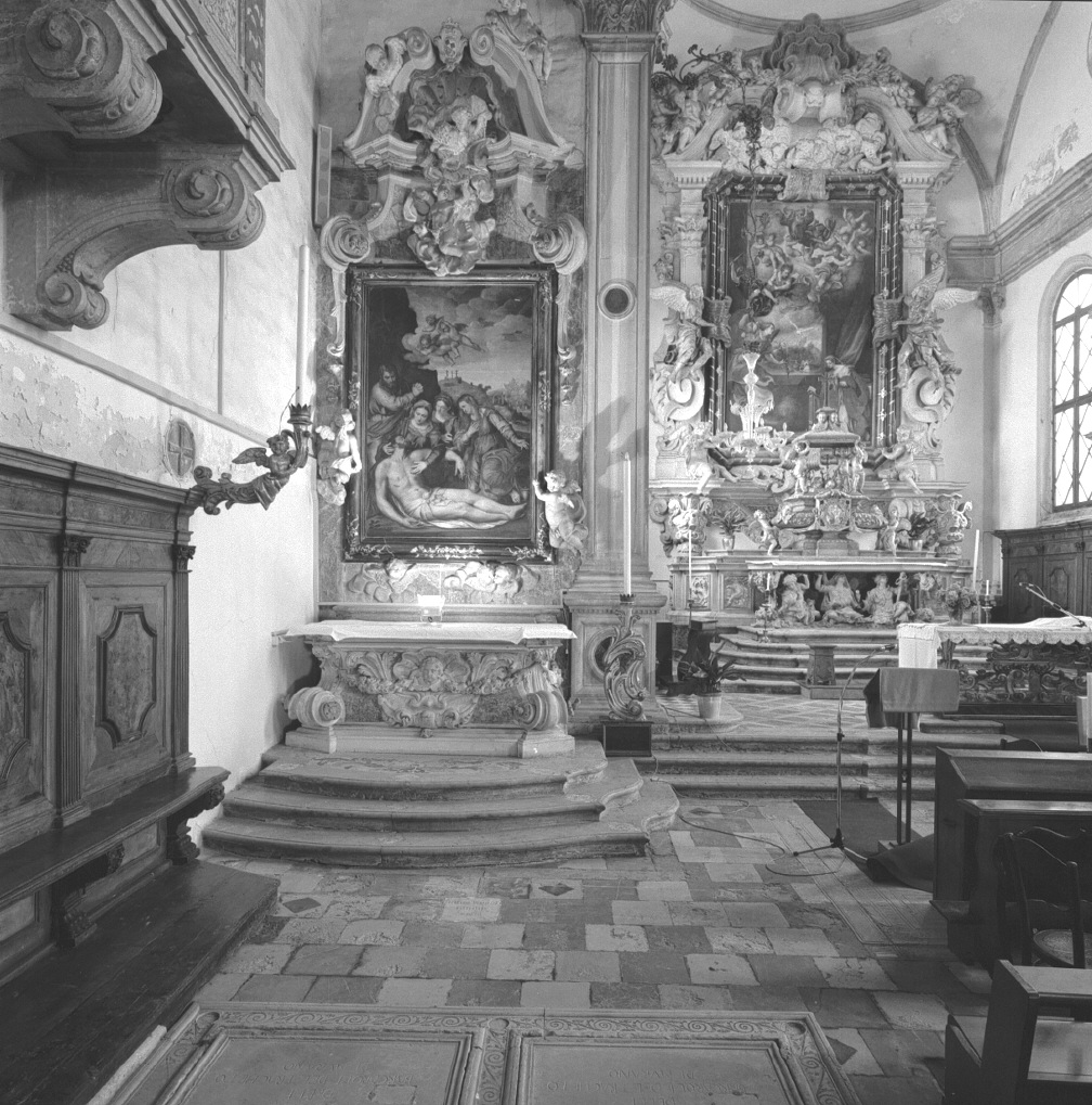 Paliotto ricco di bassorilievi. Alzato costituito da una cornice decorata da angeli, volute, ghirlande. Cornicione a segmenti rientranti. Timpano a volute con cherubini