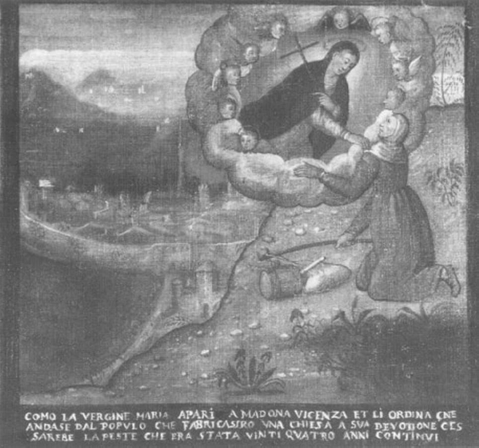- ISCRIZIONI Sotto la scena - COMO LA VERGINE MARIA APARI A MADONA VICENZA ET LI ORDINA CHE/ ANDASE DAL POPVLO CHE FABRICASERO UNA CHIESA A SVA DEVOTIONE CES/ AREBE LA PESTE CHE ERA STATA VINTI QVATRO ANNI CONTINVI - lettere capitali - a pennello - italiano con inflessioni dialettali