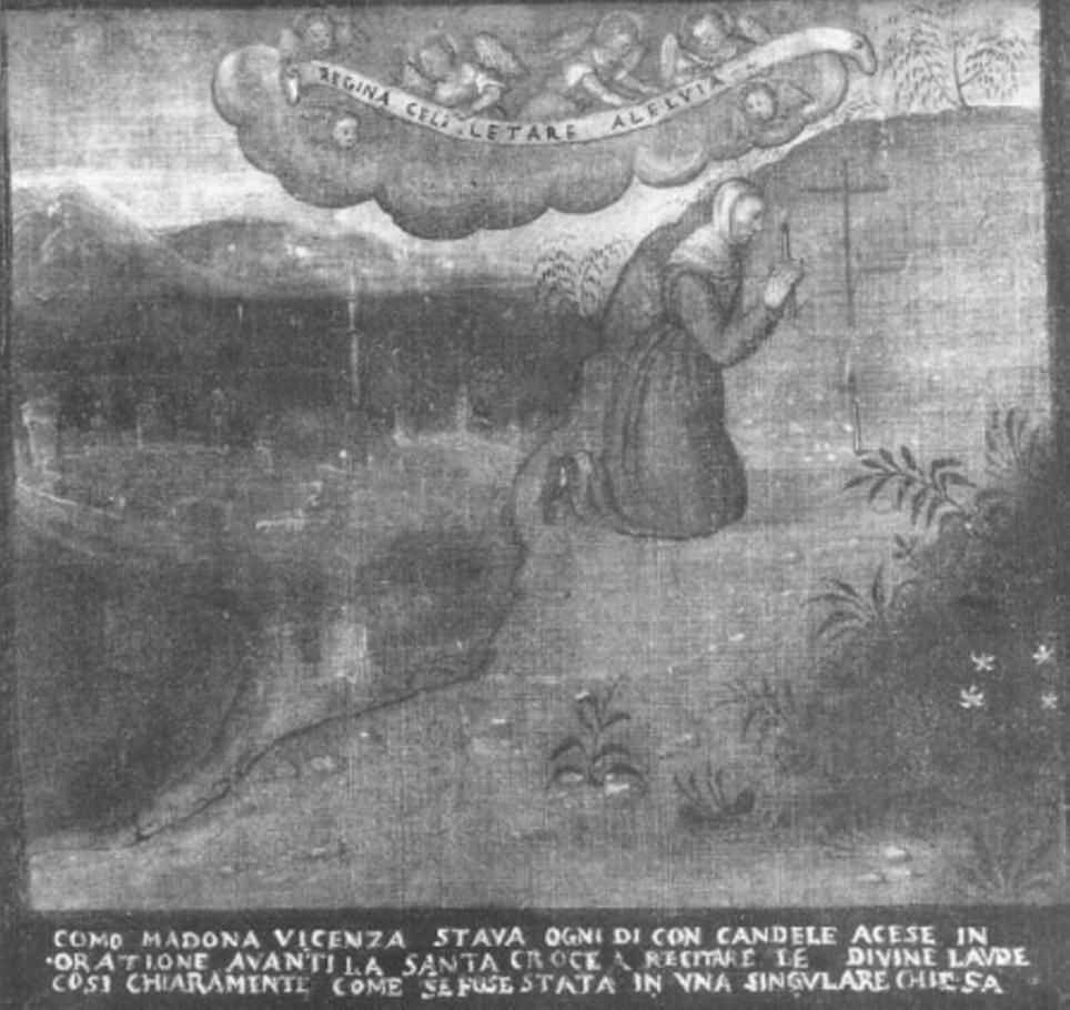 - ISCRIZIONI In basso - COMO MADONA VINCENZA STAVA OGNI DI CON CANDELE ACESE IN / ORATIONE AVANTI LA SANTA CROCE A RECITARE LE DIVINE LAVDE / COSI CHIARAMENTE COME SE FOSE STATA IN VNA SINGVLARE CHIESA - lettere capitali - a pennello - italiano con inflessioni dialettali