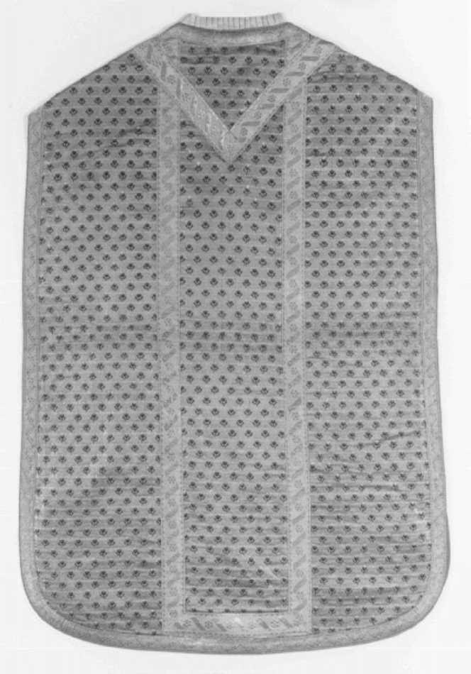 Tessuto: fondo giallo con trama lanciata in oro lamellare e con motivi ottenuti per trame lanciate in sete policrome. Galloni: a telaio in oro filato e seta gialla
