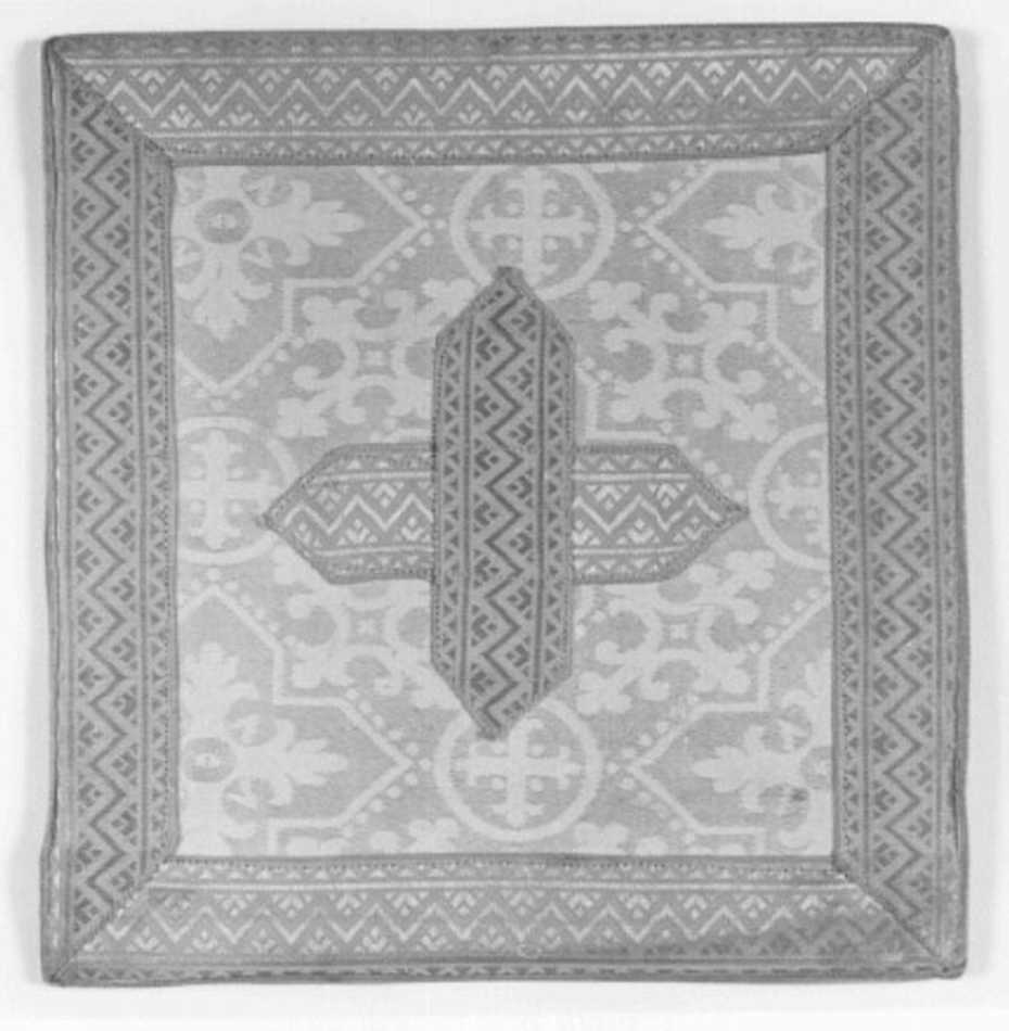 Tessuto: monocromo bianco, fondo raso faccia-catena, disegno gros de tours. Gallone: a telaio in cotone bianco e seta gialla
