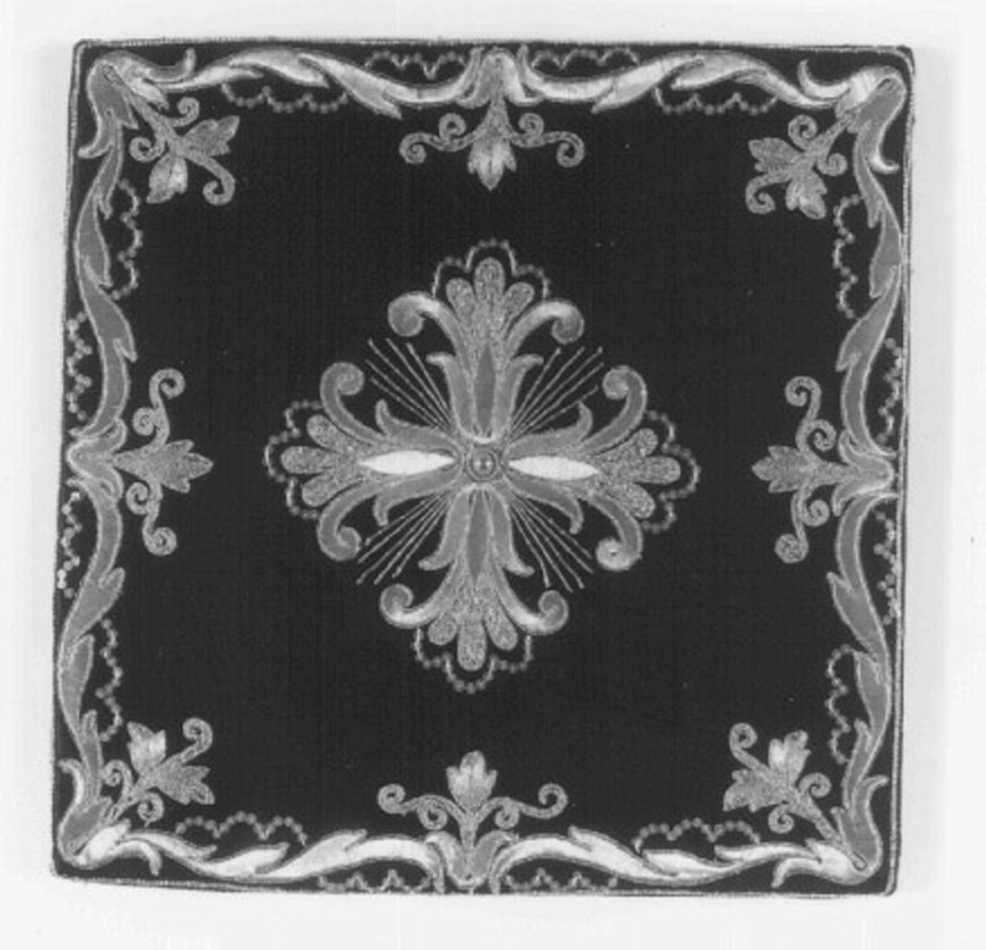 Tessuto: ricamo in oro filato, oro riccio e paillettes su seta nera. Gallone: a fuselli in oro filato e lamellare