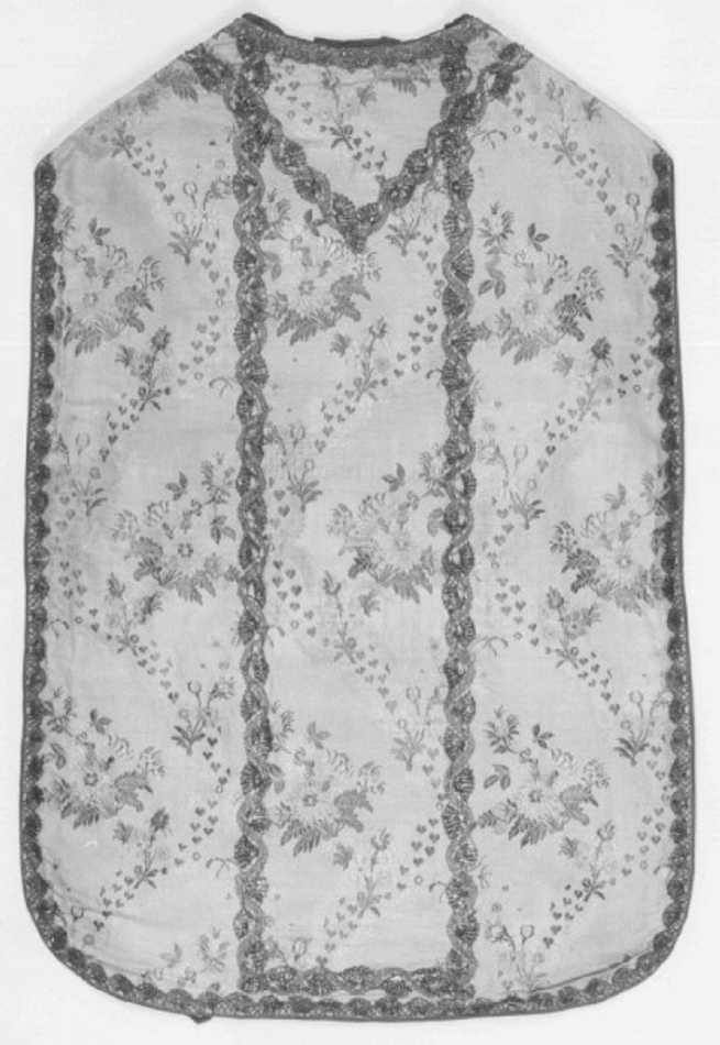 Tessuto: fondo avorio con motivi ottenuti per trame liseré lanciate e broccate in sete policrome. Gallone: a fuselli in oro filato e lamellare