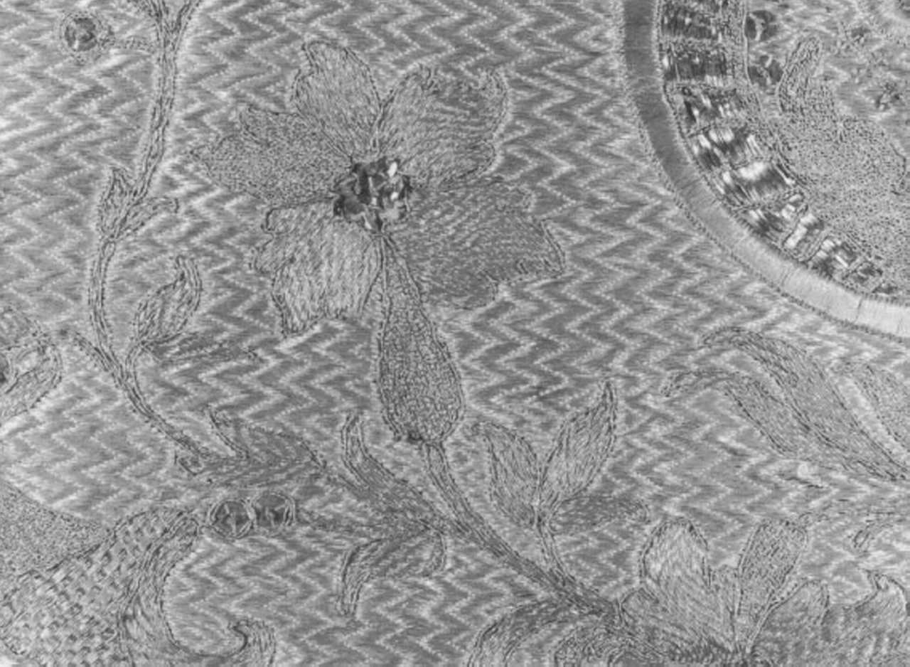 - NOTIZIE STORICO CRITICHE Tessuto fondo bianco completamente coperto da ricamo a punto fiamma (?) in argento filato, motivi ottenuti per ricami in oro filato riccio lamellare e paillettes