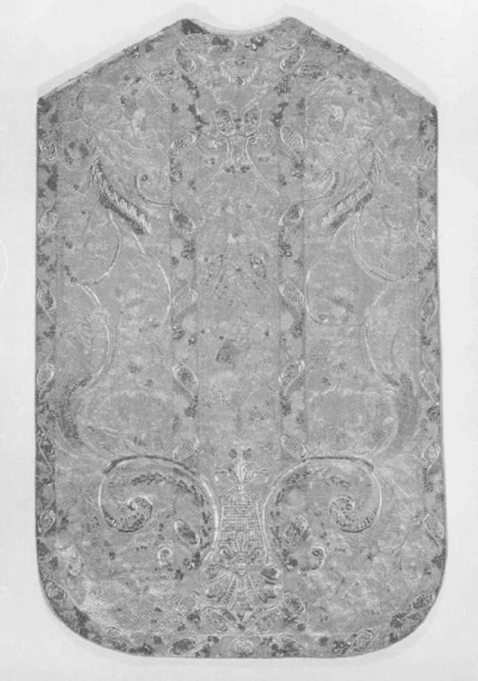 - NOTIZIE STORICO CRITICHE Tessuto : fondo bianco completamente coperto da ricamo a punto fiamma (?) in argento filato, motivi ottenuti per ricami in oro filato riccio lamellare e paillettes