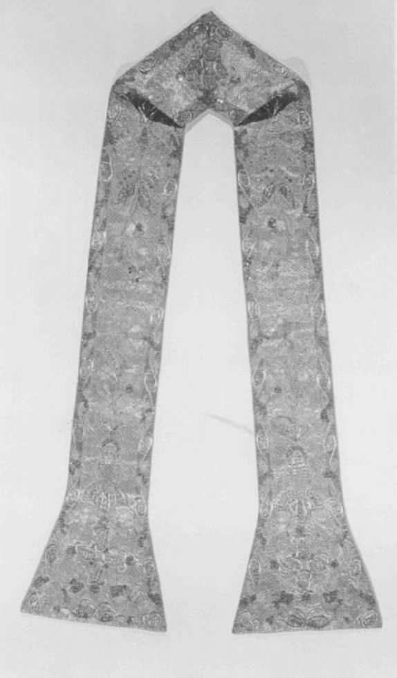 - NOTIZIE STORICO CRITICHE Tessuto : fondo bianco completamente coperto da ricamo a punto fiamma (?) in argento filato, motivi ottenuti per ricami in oro filato riccio lamellare e paillettes. fodera : taffetas rosa pesca